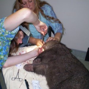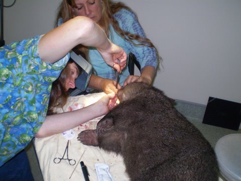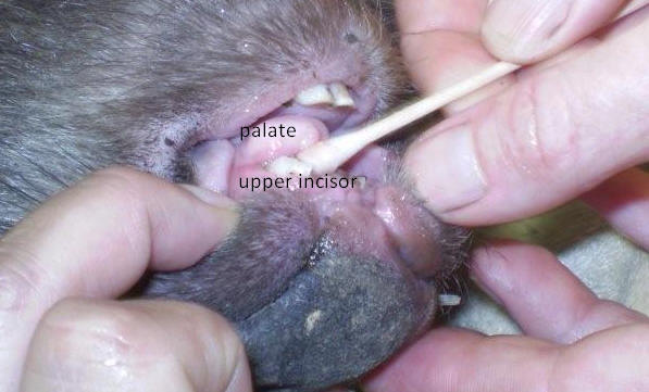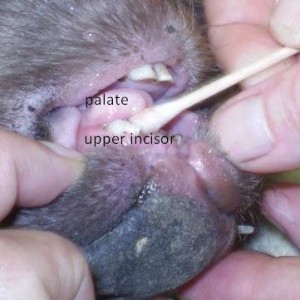 After she was given pain relief and a mild sedative, Roz discovered that her front teeth were broken and she had bruising and bleeding all around her mouth. She was also painful over her pelvis. After being stablized overnight and given fluids and antibiotics, a full exam under anaesthesia the next day showed that all of the soft tissue over her hard palate was ripped from the bone and dirt and gravel was packed in, the defect. Her top incisors were broken at the gum line and xrays showed two fractures in her pelvis. Her mouth was flushed and the tissue sutured back in place and the edges of her teeth filed even . Because of the injuries to her mouth, she was unable to eat hard food or grass. Roz made a slurry and bottle fed Crash for weeks until her mouth healed and she was pain free.
